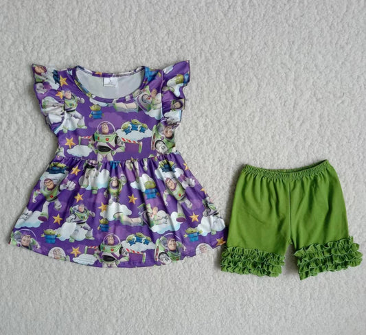 Promotion B18-2 Purple puffy short sleeve green ruffles shorts summer girl outfits RTS 1221