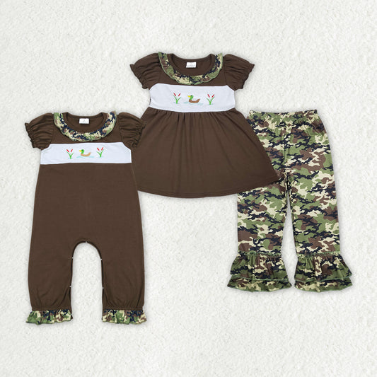 SR0582 embroidery duck short sleeve camo girl romper 202405 rts sibling
