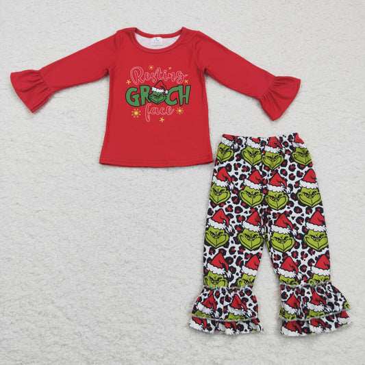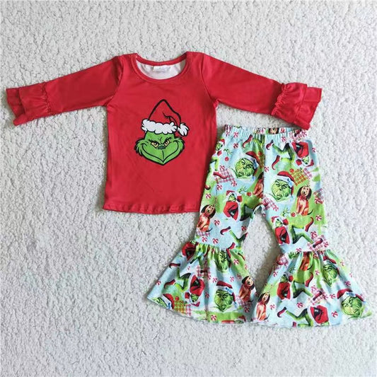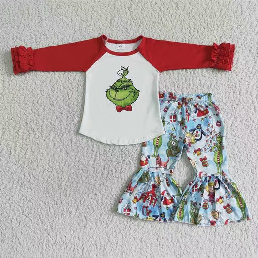 promotion 6 C9-25 Christmas girl green cartoon ruffles long sleeve bell bottom pants girl outfit 20230524 RTStion