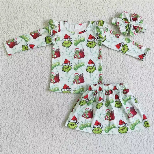GLD0081 RTS (Choose handband below)Christmas green grin cartoon long sleeve baby girl skirt outfit 20230527