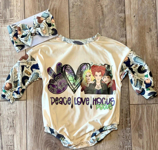 Preorder (headband pls choose below ) halloween pumpkin peace love three women long sleeve baby girl boy bubble romper 0728