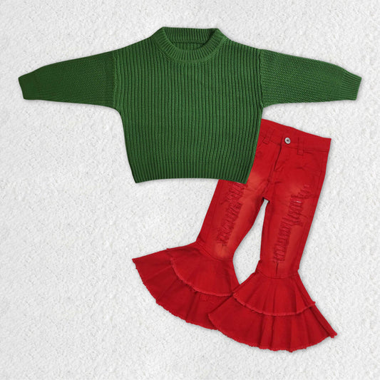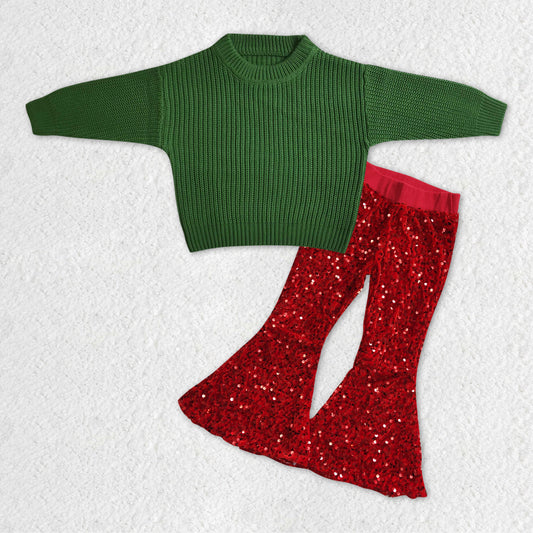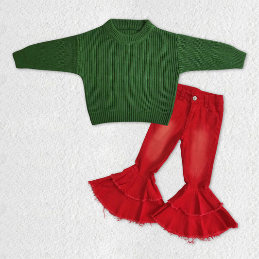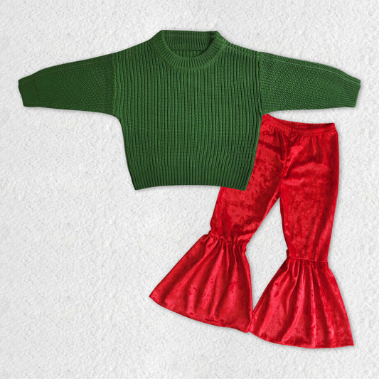 GLP1063 RTS long sleeve green sweater colorful red velvet pants girl outfit 20231121
