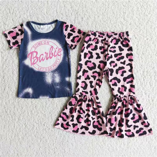 E8-1 pink raglan leopard print letters short sleeve bell bottom pant girl outfit 20230429 RTS