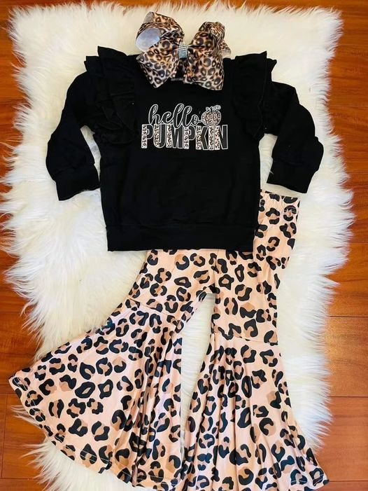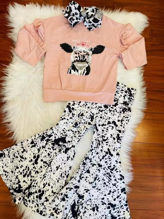 RTS 0628 pink long sleeve top cow floral white black leopard bell pants girl outfit