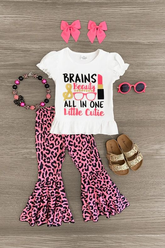 RTS brains beauty lipstick hot pink leopard short sleeves leopard bell bottom pants girl clothes real pic 0615
