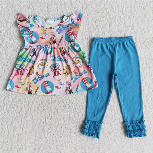 cartoon reading cat hat letters blue puffy short sleeve blue legging pant girl outfit RTS