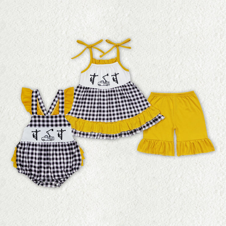 Promotion RTS LR0015 Embroidery black white stripe car truck long sleeve girls romper sibling RTS 0808