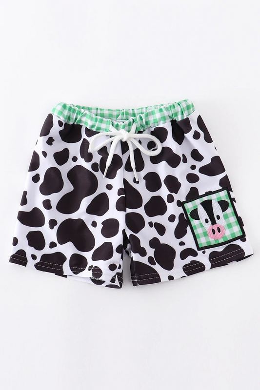 cow embroidery print green white plaid boy swimming trunks shorts 0411