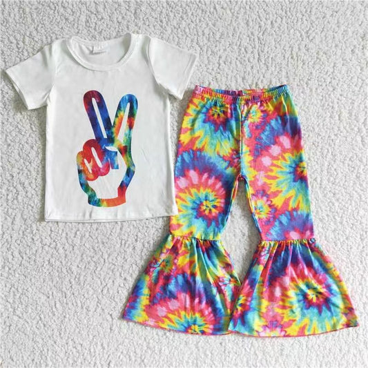 Aa-2 tie-dyed colorful short sleeve bell bottom girl outfit 20230412 RTS