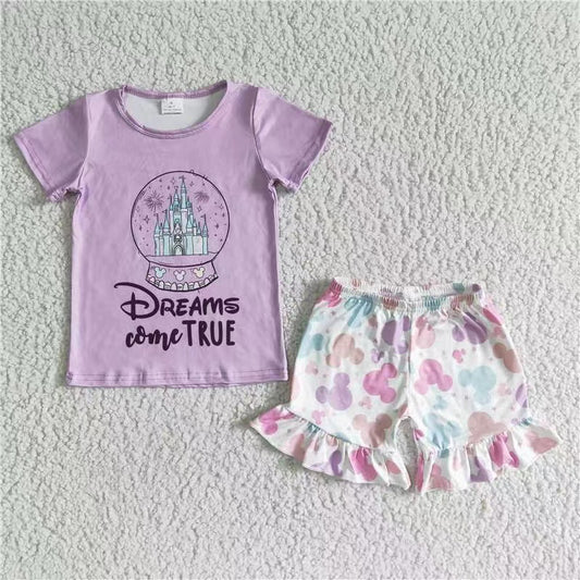 GSSO0050 RTS disney cartoon mouse dreams come true castle crystal ball purple ruffles short sleeve shorts girl outfits 1121 RTS