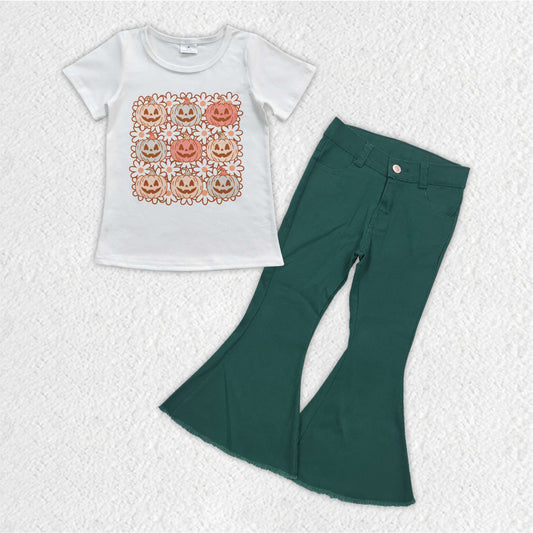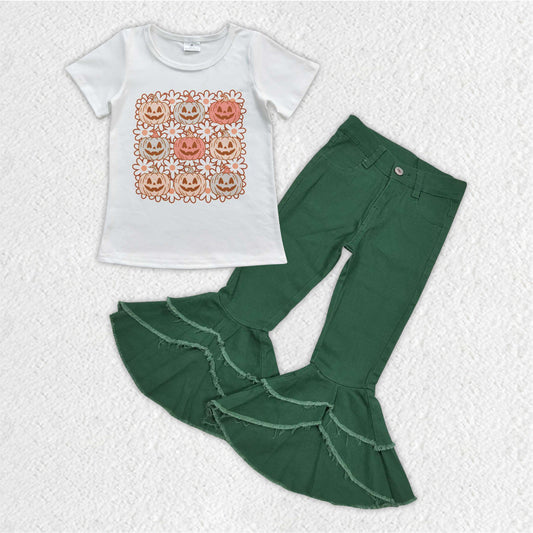 GSPO0870 fall short sleeve orange pumpkin Halloween green denim jeans girl outfit 20230830