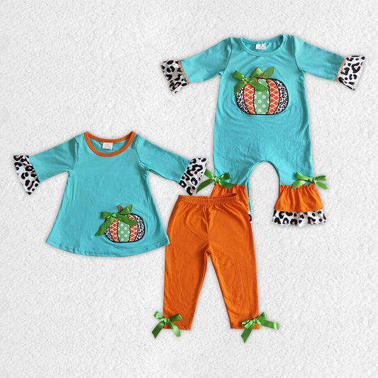 promotion Embroidery cartoon pumpkin green bow girl lace blue long sleeve romper 20230621 RTS