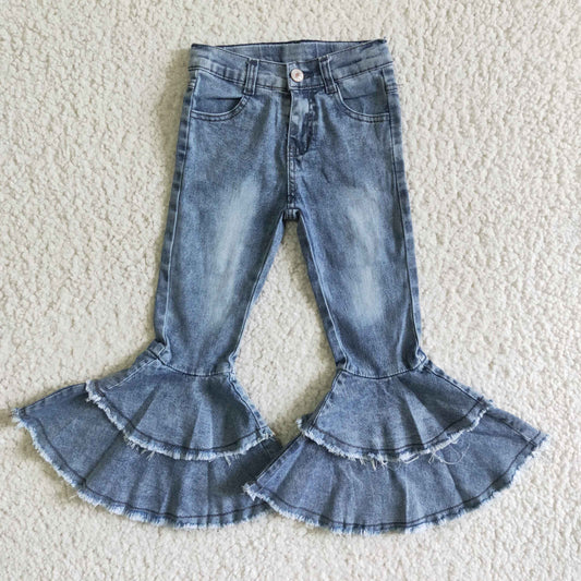 C5-15 Fashion girl bleached double ruffles denim jeans pants 202501 RTS