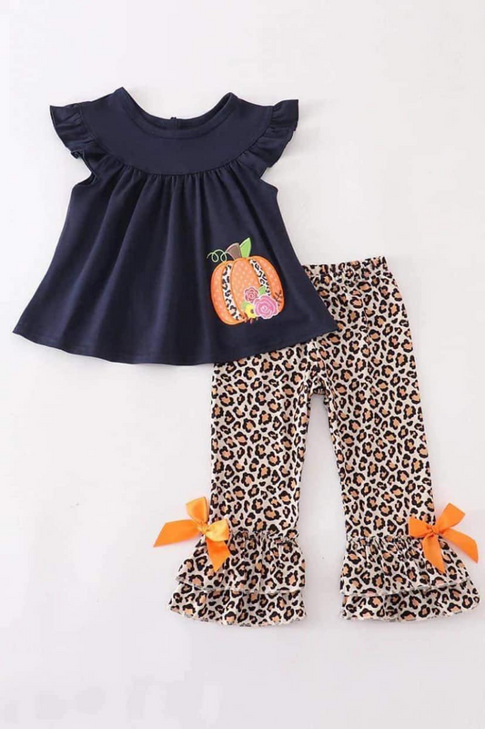 RTS 0719 embroidery blue short sleeve orange pumpkin leopard pants bow girl outfit clothes 0719