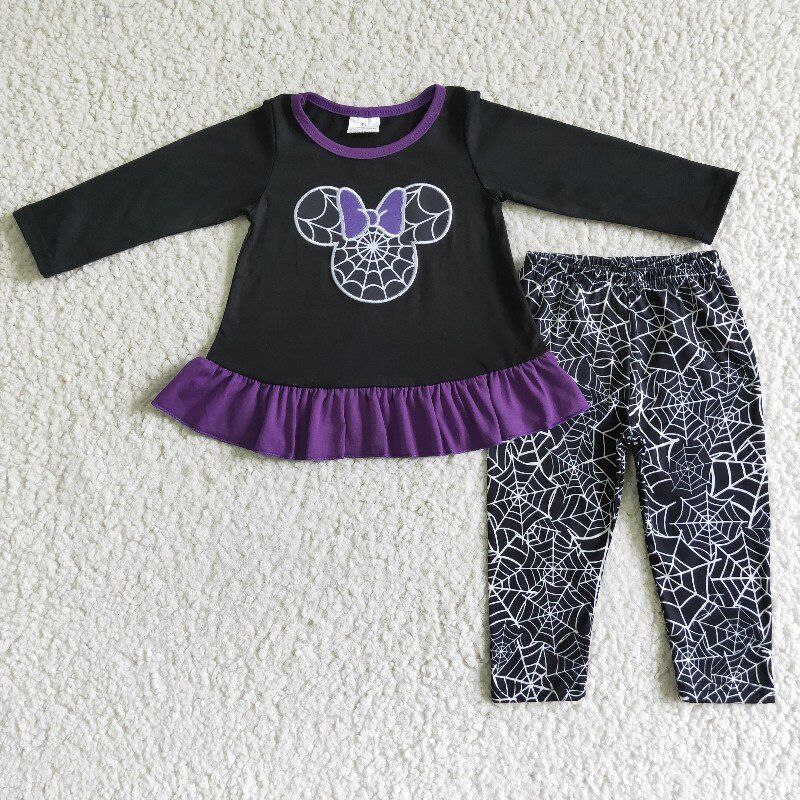 0824 RTS embroidered black purple top long shoulder net print girl outfit