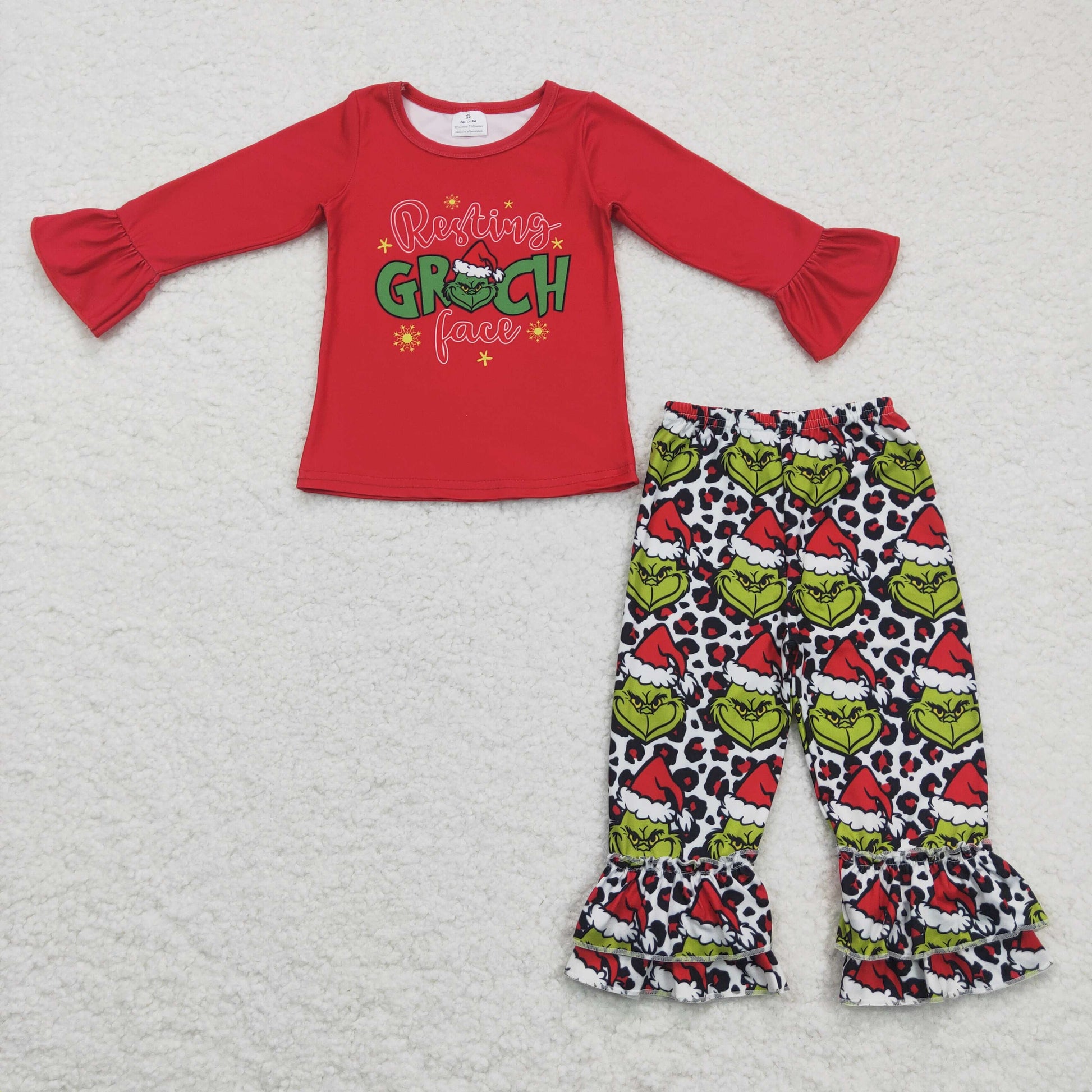 promotion 6 A1-17 Christmas girl green GRIN cartoon red leopard lace long sleeve pants outfits 1128 RTS