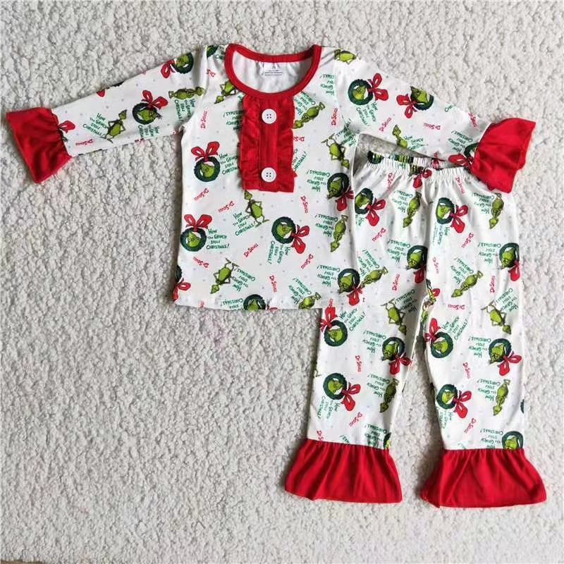 promotion 6A20-3 Girl green cartoon button long sleeve top red lace pants pajamas outfit 20230720 RTS