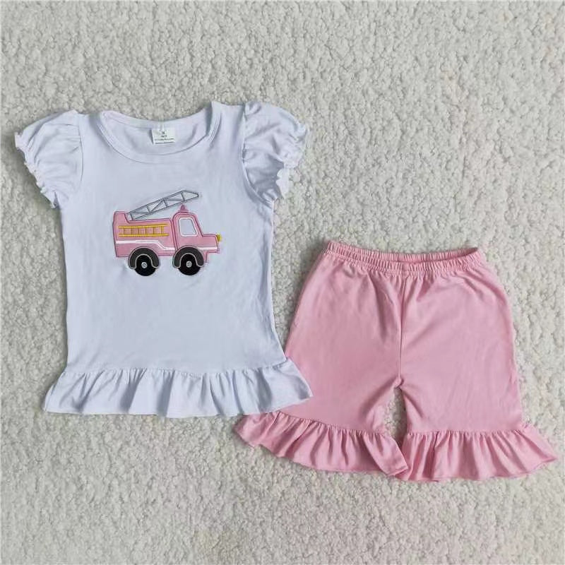 B3-4 Firetruck embroidery white red plaid girl summer short sleeve shorts outfits 20230330 RTS