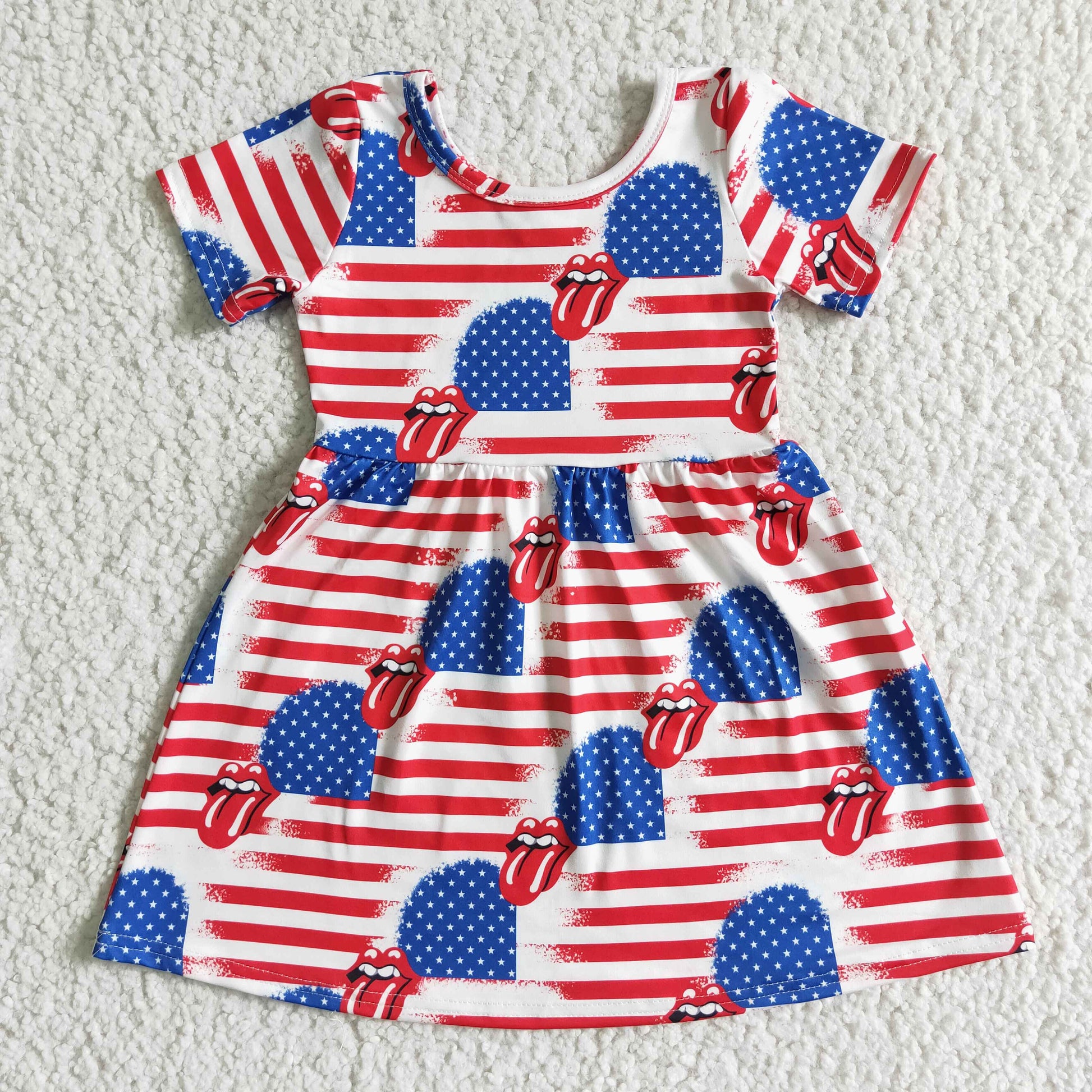 GSD0082 RTS tongue blue red 4th July American National pink stripe short sleeve summer girl dress 05070429