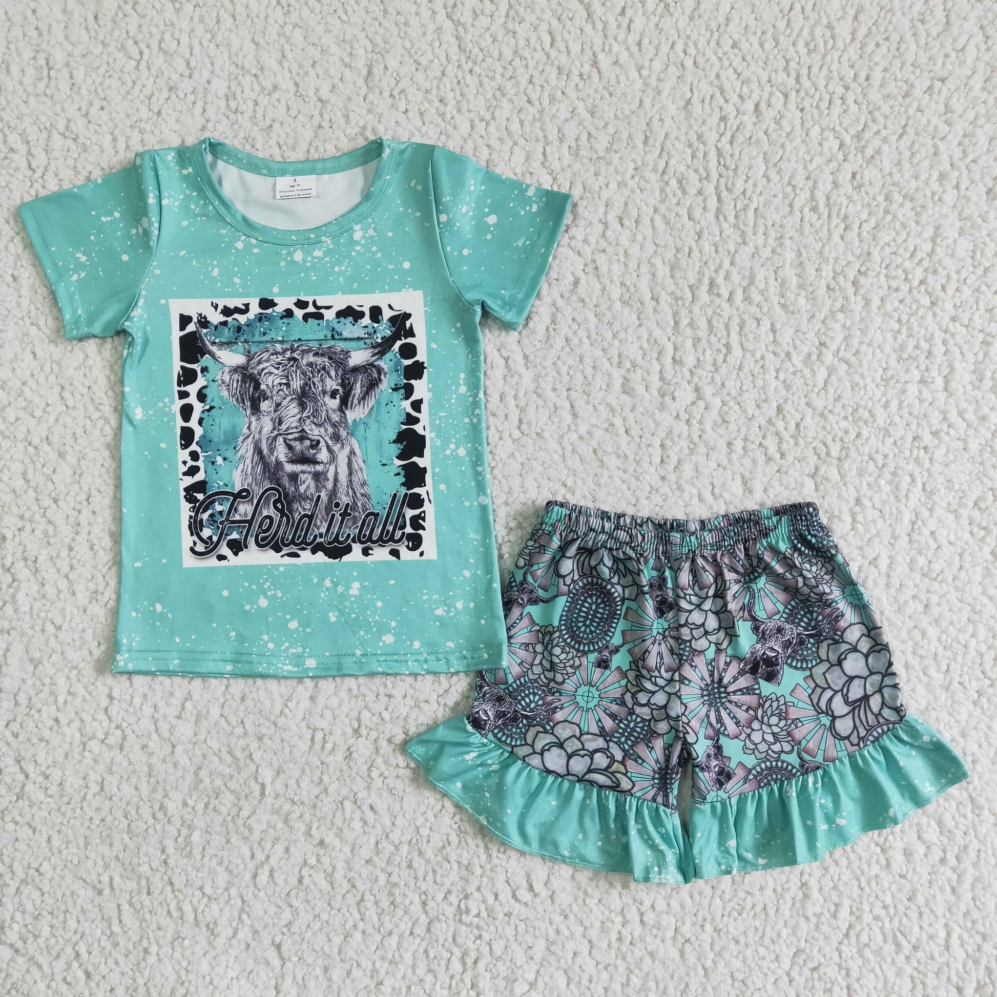 promotion heidi leopard cow green gem short sleeve girl shorts outfit 0615 RTS