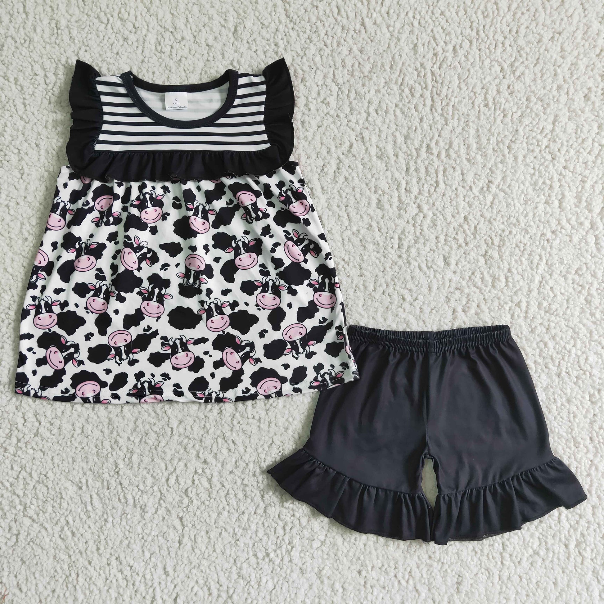 pink cow stripe print ruffles black short sleeve shorts girl outfits 0418